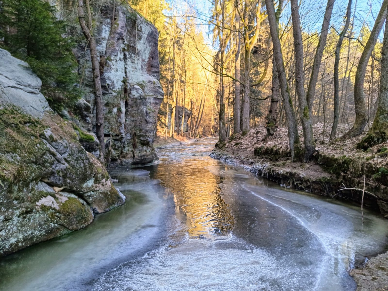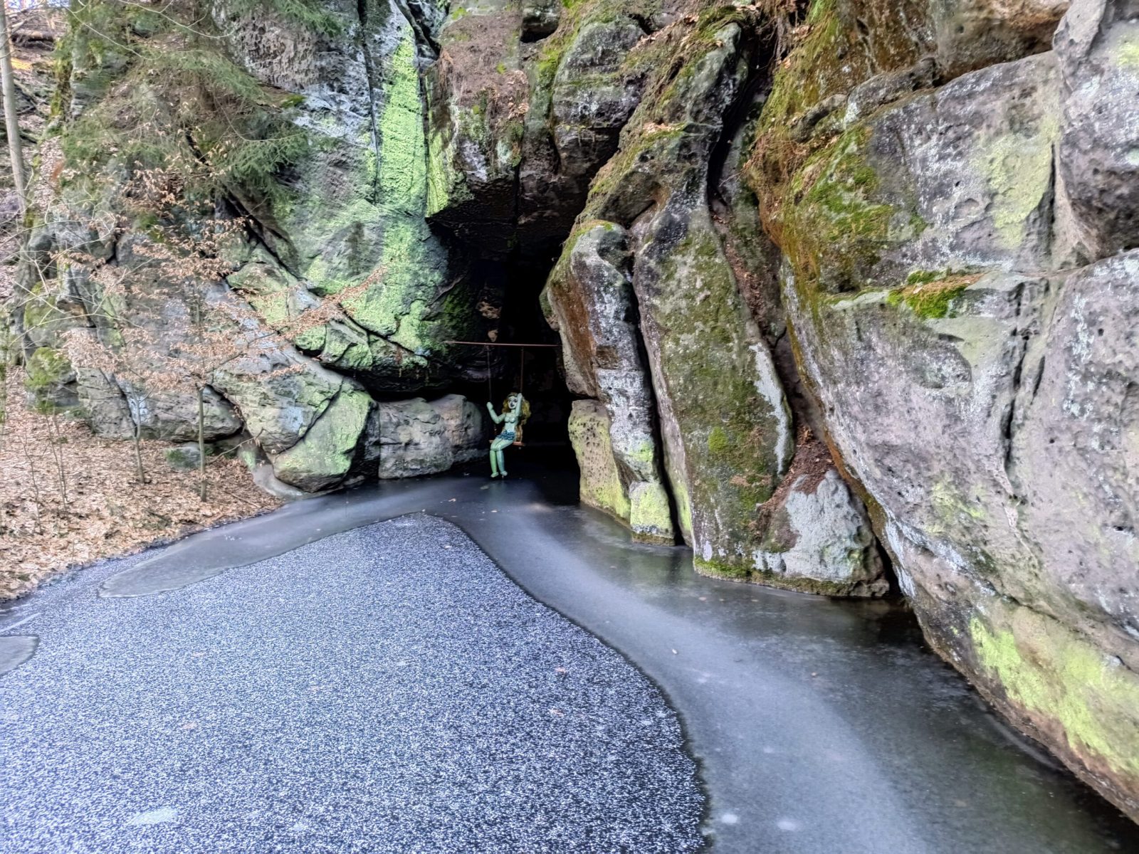 Kammtouren müssen wie schon an anderer Stelle betont nicht immer zwingend oben lang verlaufen. Das geht auch unten lang oder wie heute: durch den Paulinengrund (Pavlínino údolí) bei Dittersbach (Jetřichovice) im Nationalpark Böhmische Schweiz (Národní Park České Švýcarsko). Geplant war eigentlich eine Rundtour über Rennersdorf (Rynartice) mit Kurzbesuch bei den Zwergen und durch die Dittersbacher Felsenwelt zurück zum Startort. Daraus wurde leider nichts, da sich der Weg durch den Paulinengrund am Abzweig nach Rennersdorf als großflächig vereist und unpassierbar herausstellte. Also umkehren und eine weitere Tour unter der Rubrik „experimentelles Wandern“ verbuchen.