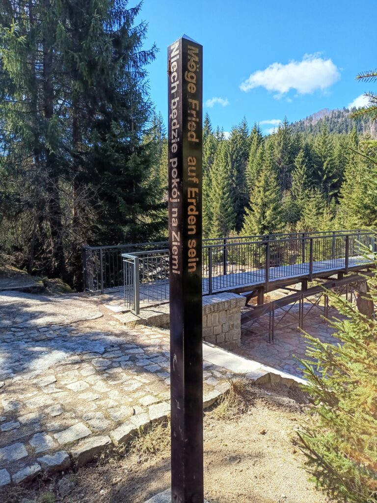Der roten Markierung und später dem Radweg folgend umgingen wir entlang der Iser bis zur Karlsbrücke den 875 m hohen Berg Granicznik. Die Karlsbrücke verband bis 1945 Deutschland und das inzwischen verschwundene Sudetenland auf dem Gebiet der Tschechoslowakei. Eine Stele auf heute polnischer Seite erinnert zweisprachig an den Friedenswunsch der Menschen.