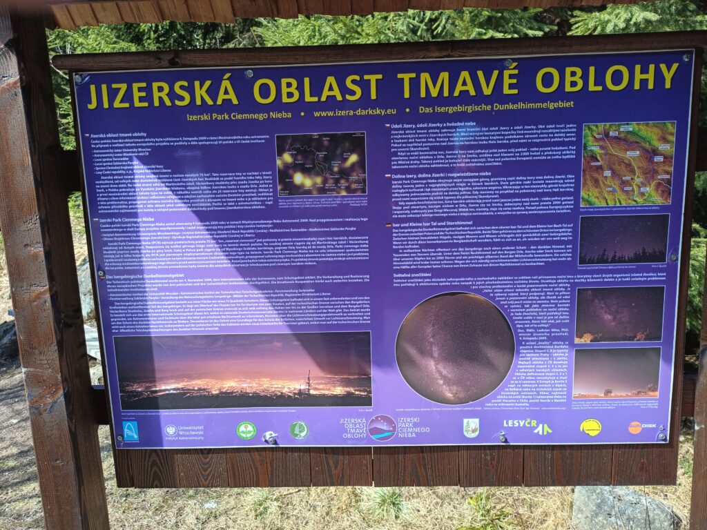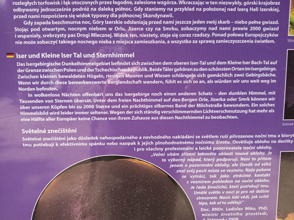 Auf der tschechischen Seite informieren mehrsprachige Tafeln über die Geschichte der Brücke und das „Dunkelhimmelgebiet“ Isergebirge. In Deutschland, z.B. der Rhön, nennt man solche Gebiete mit geringstmöglicher Lichtverschmutzung „Sternenparks“.