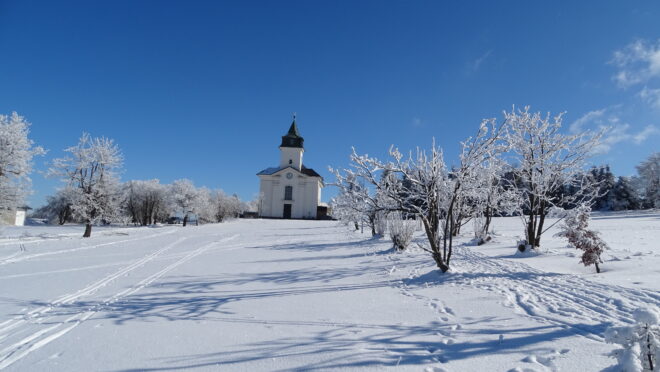 Für den Rückweg nutzten wir den rot markierten Wanderweg, der inzwischen ebenfalls zur Via Czechia gehört. Deutlich erlebnisreicher und angenehmer ist er zu gehen und führt durch dichten Mischwald, bevor sich eine weite Wiesenlandschaft vor unseren Blicken ausbreitet. Das letzte Stück des Weges führt uns vorbei am alten Friedhof mit zahlreichen deutschen Gräbern und schließlich entlang der Bahntrasse in die Ortsmitte, wo unsere Tour endet.