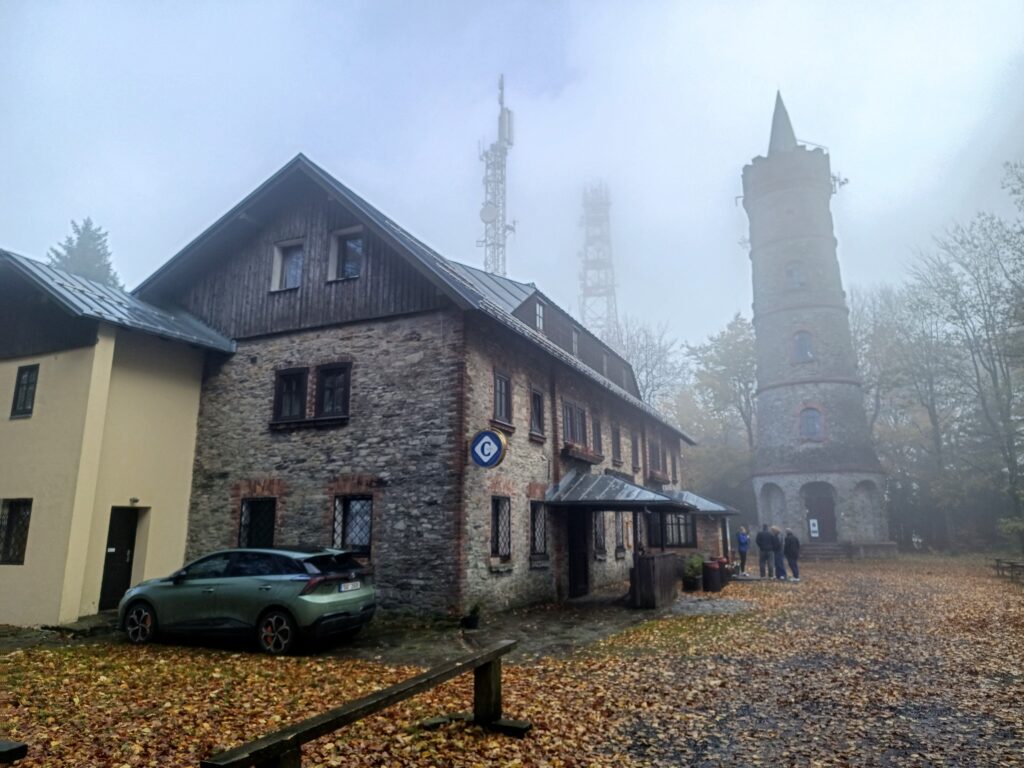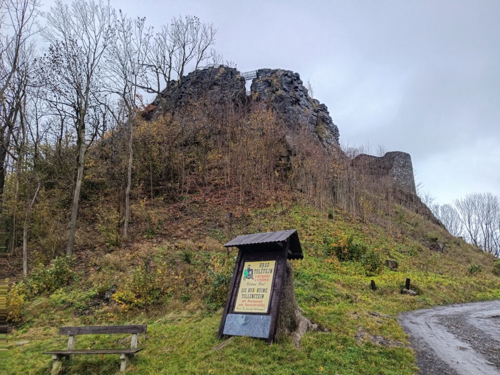 Beim Start am Bahnhof Jedlova lagen die Wolken noch auf dem Gipfel des gleichnamigen Berges auf. Da Wetterbesserung vorhergesagt war, entschieden wir uns, zuerst die Burgruine Tolštejn (deutsch: Tollenstein) aufzusuchen. Der Tollenstein war vor einigen Jahren Namensgeber eines grenzüberschreitenden touristischen Projektes in Sachsen und Nordböhmen, der Tollensteiner Herrschaft (tschechisch: Tolštejnské panství). Leider scheint das Projekt nicht mehr fortgesetzt zu werden. Zumindest war nirgendwo Werbung dafür zu entdecken.