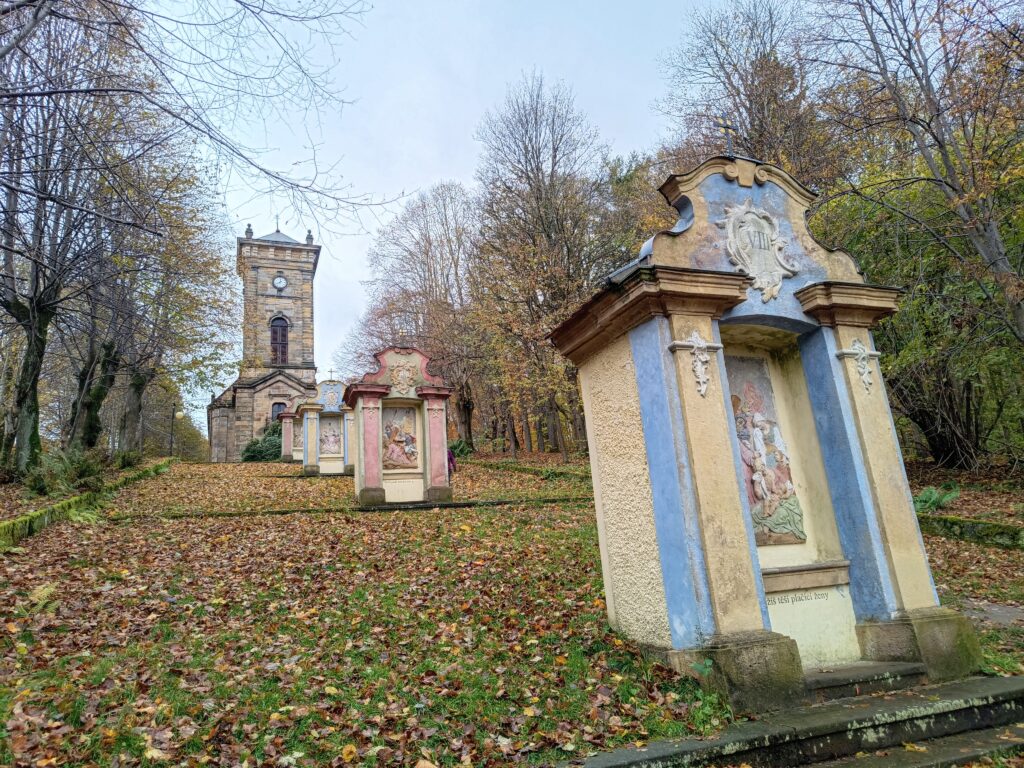 Vom Tollenstein begaben wir uns zum Aufstieg auf den Tannenberg. Wir wählten dafür einen schmalen Weg durch die Bergflanke und über Blockgestein, der in keinem Wanderführer beschrieben wird. Oben angekommen fanden wir uns in den Wolken wieder. Als wir jedoch die Bergbaude nach kurzer Rast wieder verließen, hatte sich die Sonne durchgesetzt und wir konnten die zauberhafte Landschaft des Lausitzer Gebirges genießen. Auf dem Weg nach Jiřetín pod Jedlovou (deutsch: Sankt Georgenthal) passierten wir den renovierten Kreuzweg auf dem gleichnamigen Berg.